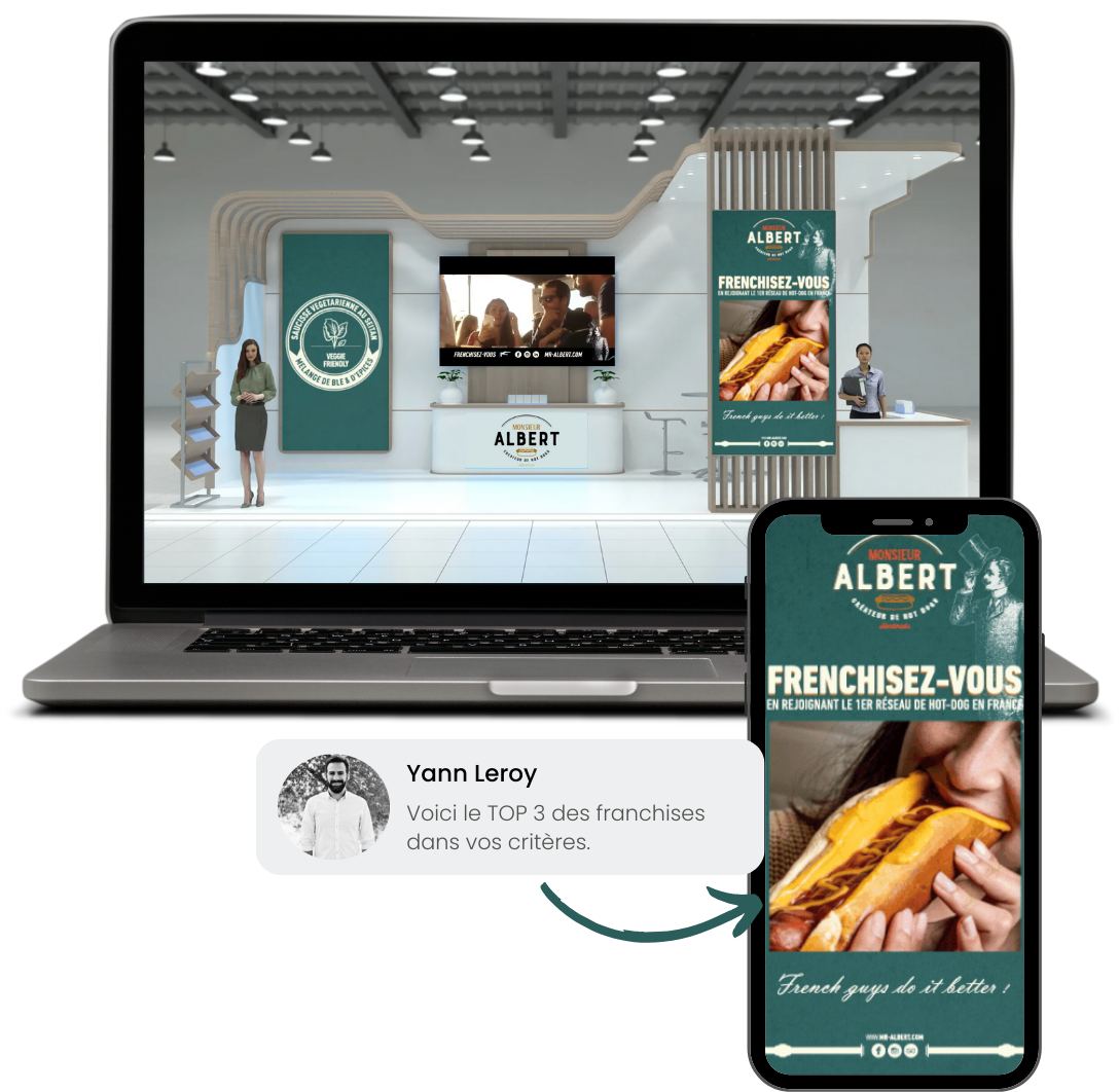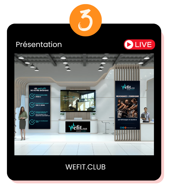 Vous découvrirez les stands virtuels de toutes les franchises. Sur chacun des stands, vous retrouverez : webinaires, présentation vidéos, chiffres clés et la possibilité d'échanger avec un expert si vous êtes intéressés.